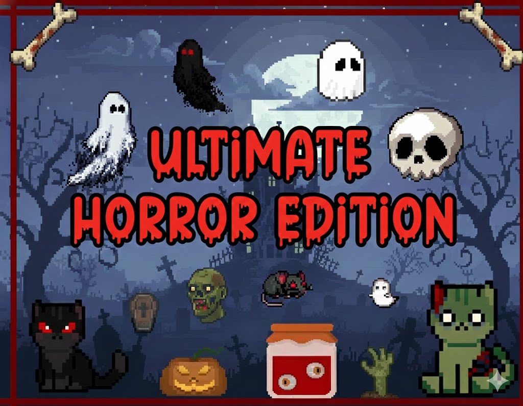 Ultimate Horror Edition is a creepy pixel art pack filled with spooky characters and Halloween inspired icons. Featuring ghosts, skulls, cursed creatures, and eerie decorations, this pack is perfect for horror games, spooky UI elements, seasonal events, or playful Halloween projects.